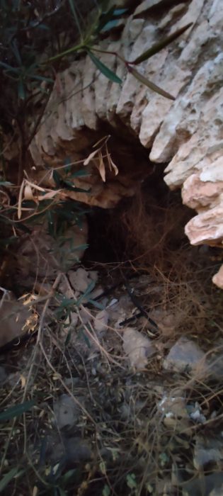 Justo en el fondo del barranco al pie de donde finaliza el acueducto, encontramos el pozo subterráneo totalmente alineado. Como vemos en la imagen el pozo está sellado con grandes piedras y por el asoma una pieza metálica, un cardan. Eso nos da una fecha probable, al parecer la bomba es de principios del siglo XX, no habían bombas sumergibles eléctricas, ésta al parecer conducía el movimiento a través de un eje giratorio o cardán al fondo del pozo. Pendiente queda por averiguar qué fuerza motriz se utilizó. NOTA, a fecha diciembre 2022 no localizamos el cardán, o no está, o está ya cubierto totalmente.