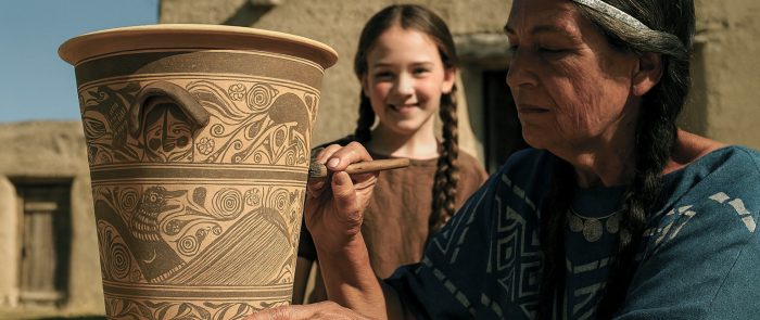 El més emblemàtic és, sens dubte, una cara femenina de galtes colorades i dues trenes, d’expressió viva i ingenua. Podria representar una xiqueta real, però també una divinitat vinculada a la natura. La càrrega simbòlica de la peça ha fet pensar que tindria un ús votiu o ritual, amb una possible reutilització com a urna funerària.