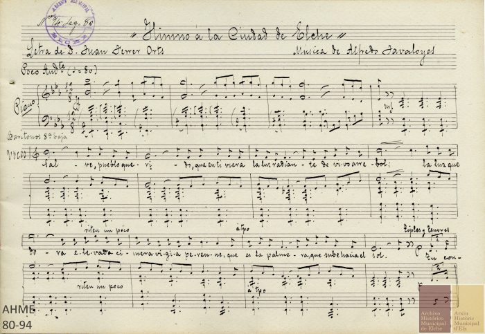 Himne a Elx. Lletra notari Juan Ferrer: Música Alfred Javaloyes. Estrena: 14 d’agost de 1929