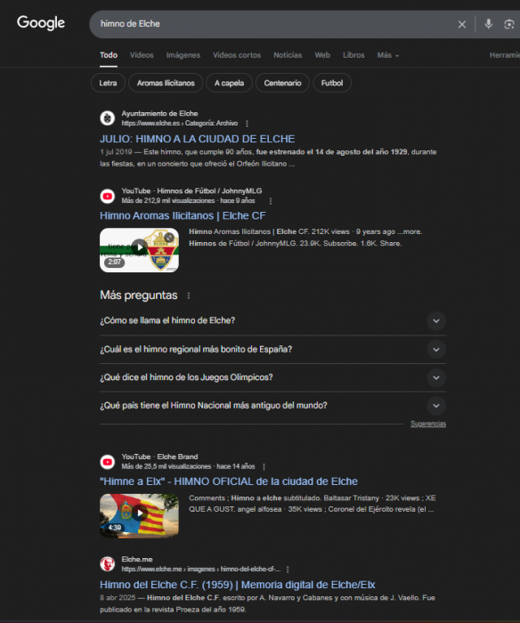 La primera búsqueda nos lleva al himno considerado como oficial, la segunda al himno del Elche C.F, una habanera muy conocida Aromas Ilicitanos, la tercera nos vuelve a mostrar el himno oficial, esta vez como vídeo de YouTube y las búsquedas cuarta y quinta nos llevan a la Cátedra Institucional Pedro Ibarra de la UMHE que nos indican de nuevo el himno del Elche C.F y el del notario Juan Ferrer Orts y el compositor Alfredo Javaloyes.