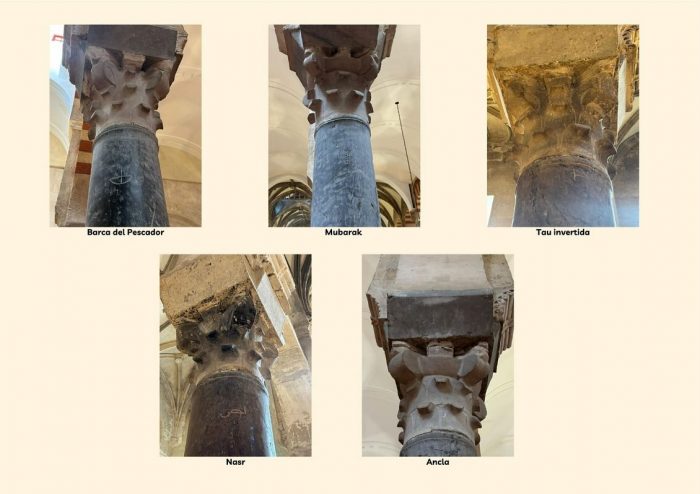 Existen en la mezquita más de 700 signos lapidarios tallados sobre los diferentes elementos de las columnas, basas, fustes, capiteles y cimacios. Los mismos se encuentran divididos en dos grandes grupos, nombres propios y signos no grafémicos.