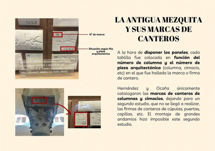 Hoy proponemos una mirada diferente. ¿Os habéis fijado alguna vez en las pequeñas incisiones que aparecen en algunas de sus columnas? Se tratan de marcas de canteros, muy comunes en muchas de las columnas y cimacios de las ampliaciones de Al – Hakam II y Almanzor de nuestra Mezquita